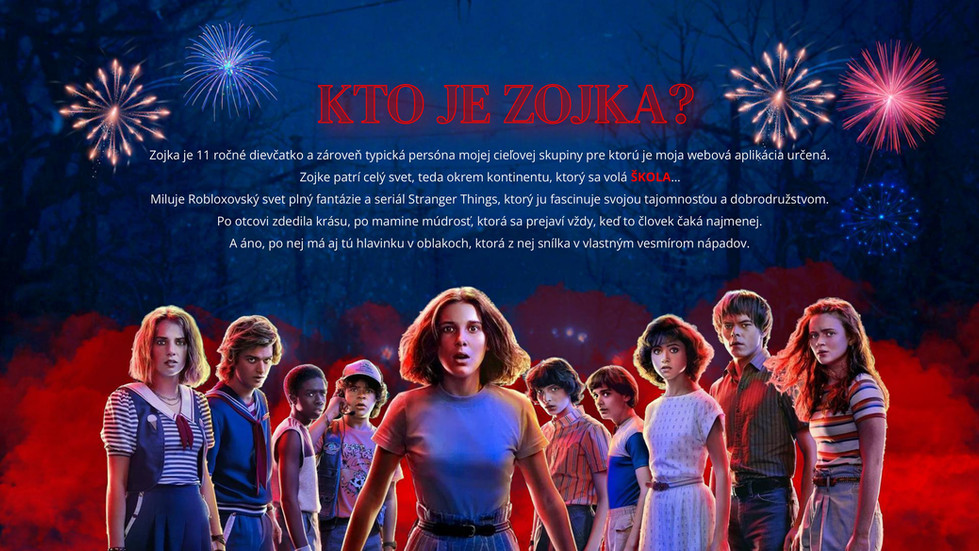 Návrh riešenia Na základe získaných informácií som sa rozhodla ísť formou webovej aplikácie, nakoľko Zojka je highly digital positive. Zároveň miluje seriál Stranger Things a samozrejme Roblox. Preto som vytvorila koncept, ktorý odrážal jej vkus a zároveň ju motivoval.